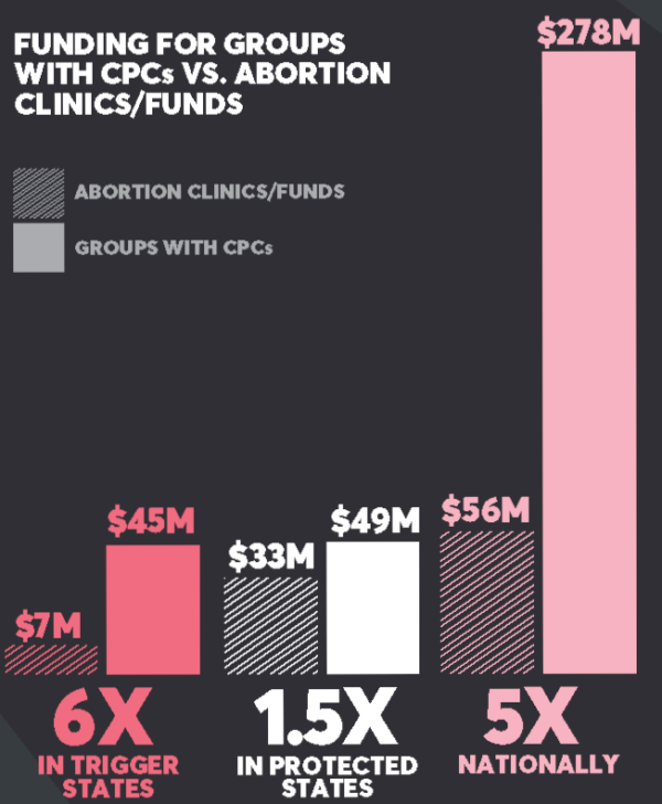 The anti-abortion movement received over $325 million in philanthropic funding from 2015-2019. With additional government funding and support from large parent organizations, the broader anti-abortion movement has amassed billions of dollars. The disparity between the funding received by the anti-abortion movement compared to the funding allocated to abortion clinics, funds, and reproductive rights organizations is significant. Nationally, the overall imbalance stands at 5:1. Even in the 16 states and DC where abortion is explicitly protected, foundation giving to groups with “crisis pregnancy” programs outpaces giving to clinics and funds. This disparity gets as high as 7:1 in trigger states.