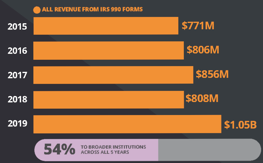 According to a report by the National Committee on Responsive Philanthropy, Candid, the main distributor of non-profit funding data, has a specific category called “Right to Life” focused on advocacy efforts for legislation and measures that assign legal rights to unborn human beings and criminalize the termination of unwanted pregnancies. From 2015-2019, this category received $53 million in foundation funding, approximately $10.6 million per year.
