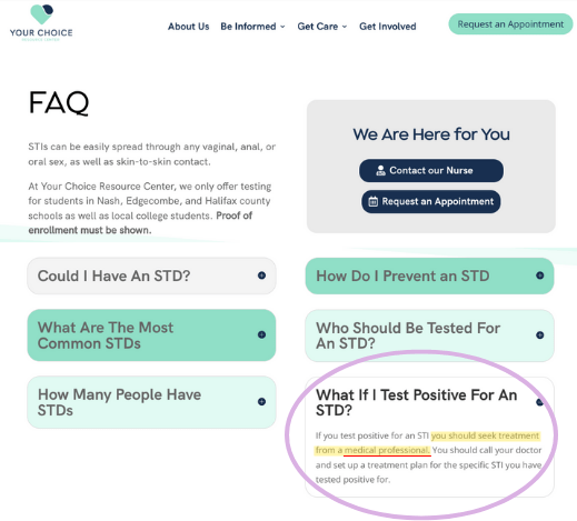 For example, this anti-abortion center in Rocky Mount, NC does not inform potential visitors what type of STIs they test for. Surprisingly, the center directs them to “seek treatment from a medical professional” for people who test positive for one of the unspecified STIs. If a facility is conducting tests for unspecified STIs, it’s interesting to consider why they would suggest that you seek treatment from a medical professional, unless they aren’t actually a medical facility.